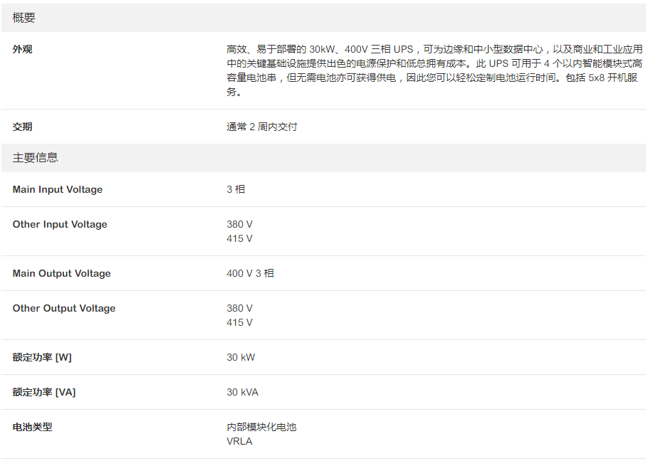 Galaxy VS UPS 30kW 400V,用于不多于 4 個內部 9Ah 智能模塊式電池串,開機 5x8     GVSUPS30K0B4HS