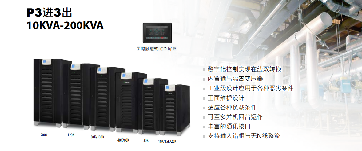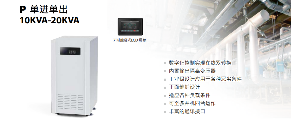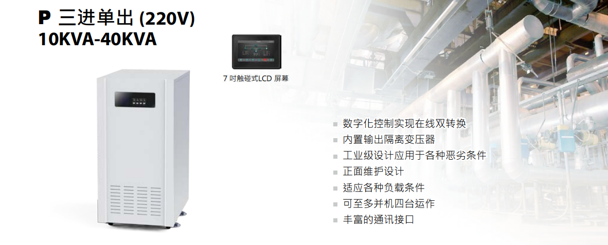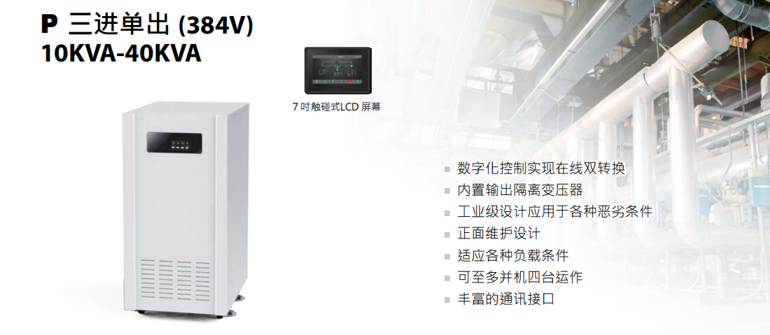 特點:工頻UPS電源主機,自帶隔離輸出變壓器,性能穩定,適應各種負載條件,豐富的通訊接口