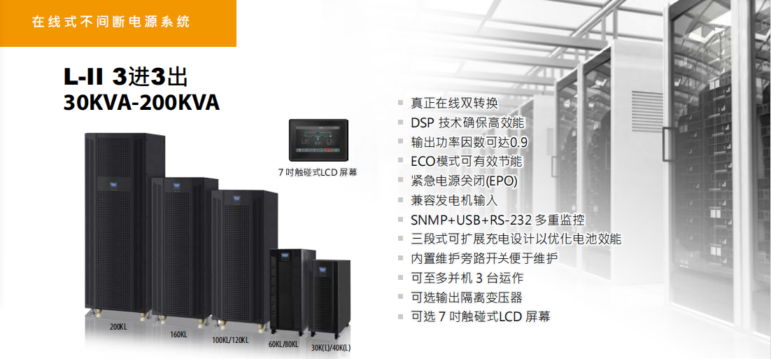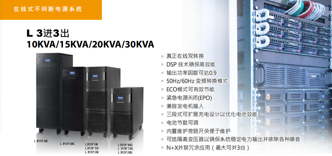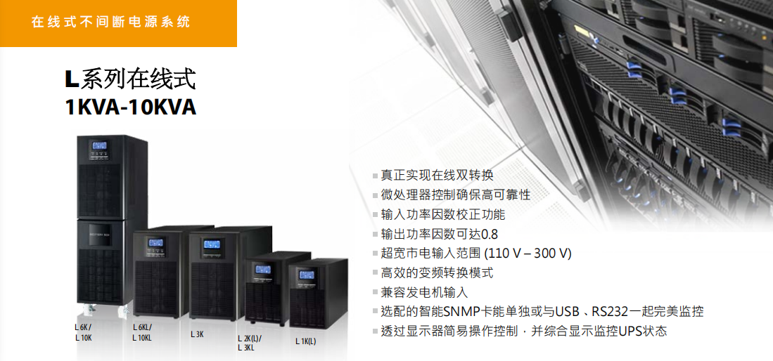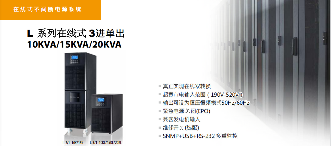 特點(diǎn):真正實(shí)現(xiàn)在線雙轉(zhuǎn)換,高效的變頻模式,兼容發(fā)電機(jī)輸入,通過顯示器簡易操作控制,并綜合顯示監(jiān)控UPS狀態(tài)。