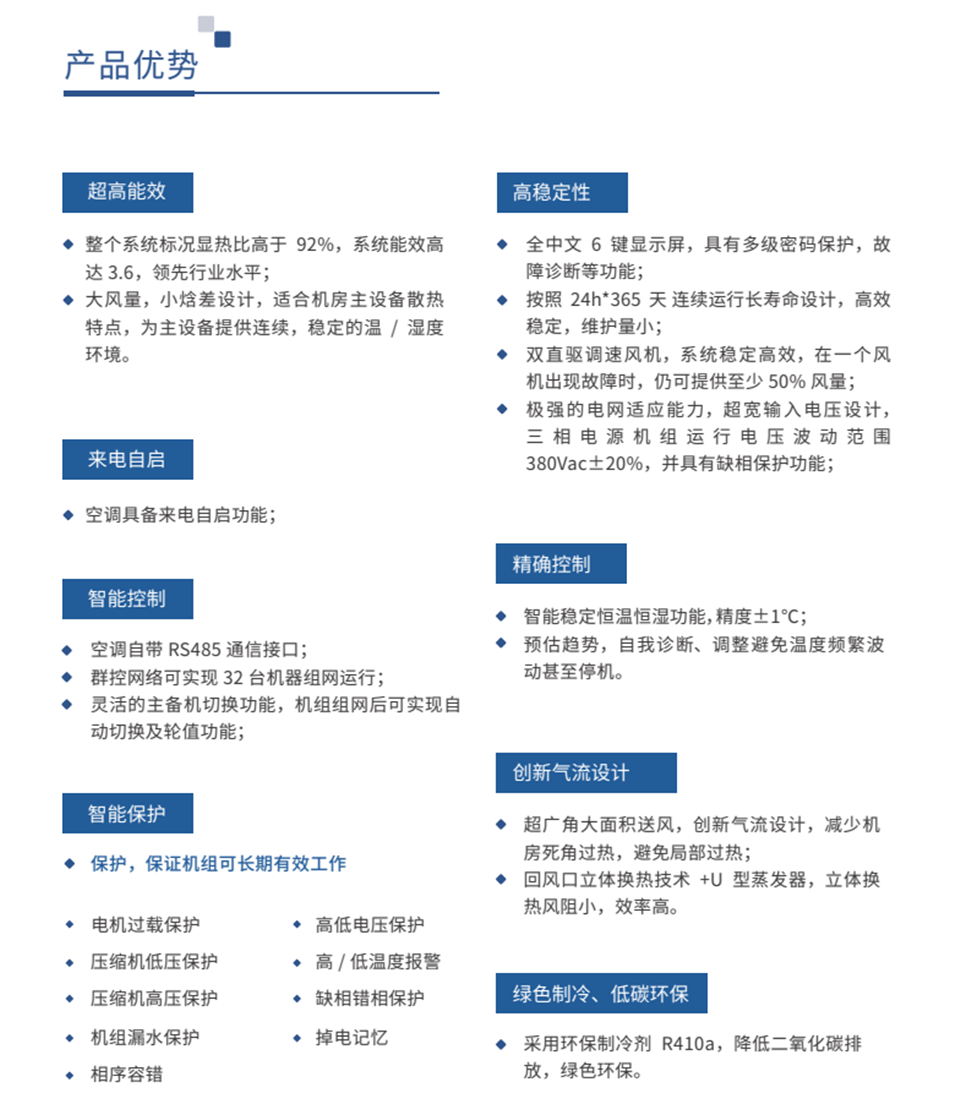 海悟機房精密空調(diào)超高能效,整個系統(tǒng)標況顯熱比高于92%,系統(tǒng)能效高達3.6,領(lǐng)先行業(yè)水平:來電自啟,空調(diào)具備來電自啟功能:智能控制:空調(diào)自帶RS485通信接口:群控網(wǎng)絡(luò)可實現(xiàn)32臺機器組網(wǎng)運行:智能保護:保護,保證機組可長期有效工作。